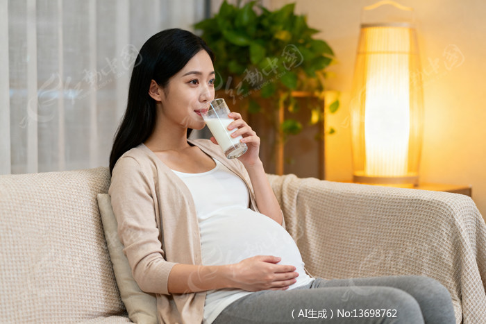 孕妇坐在沙发上喝牛奶