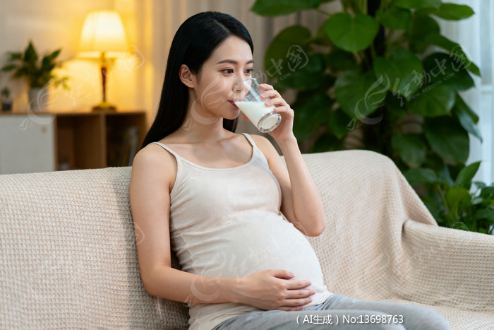 孕妇坐在沙发上喝牛奶