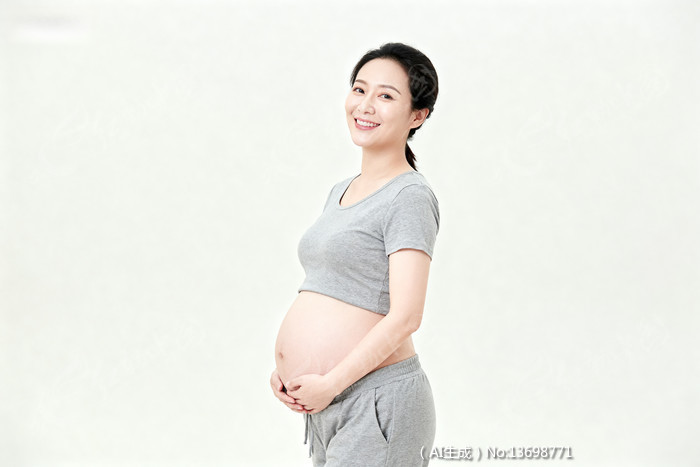 孕妇穿着灰色休闲装手托孕肚微笑站立照片