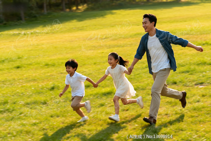 一家三口草地奔跑欢乐时光
