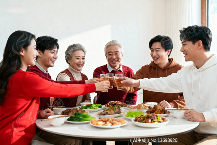 一家人围坐餐桌举杯共庆