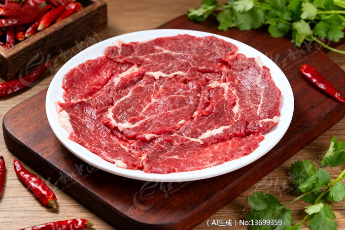 新鲜牛肉片摆盘辣椒香菜点缀