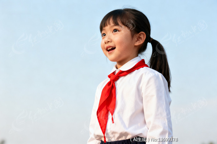 小女孩扎马尾戴红领巾面带微笑看向远方