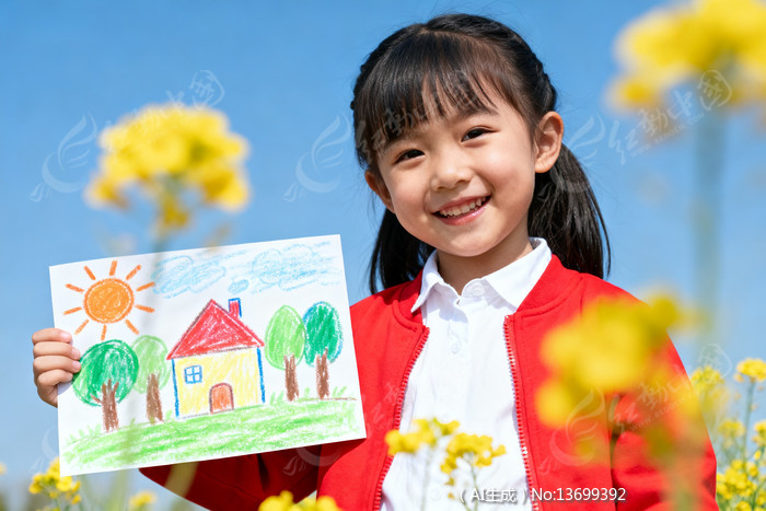 小女孩手持彩色画展示背景蓝天黄花