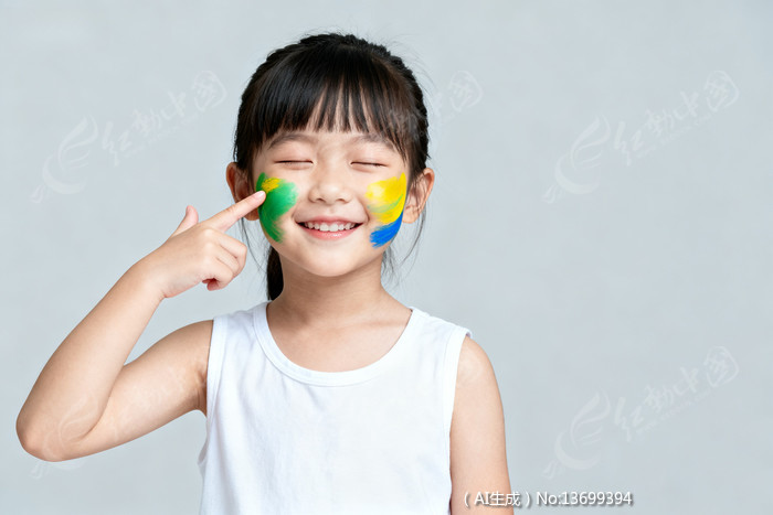 小女孩脸上涂有彩色颜料手指指向脸颊