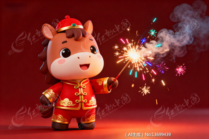 小马玩偶持烟花棒红衣喜庆迎新年