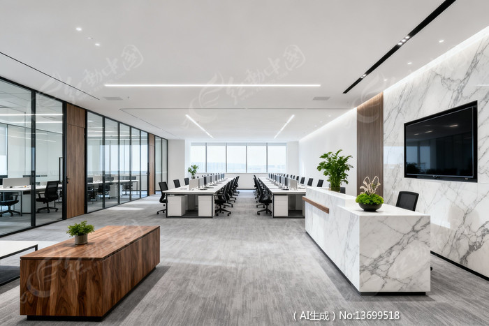 现代简约风格办公室大理石前台与玻璃隔断