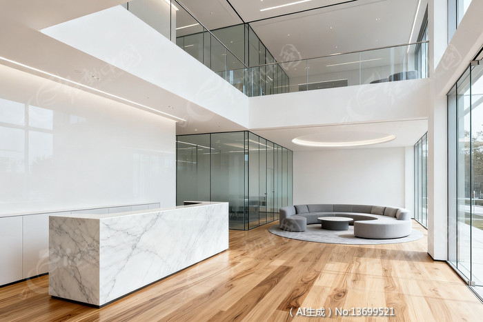 现代简约风大厅白色大理石前台与玻璃隔断
