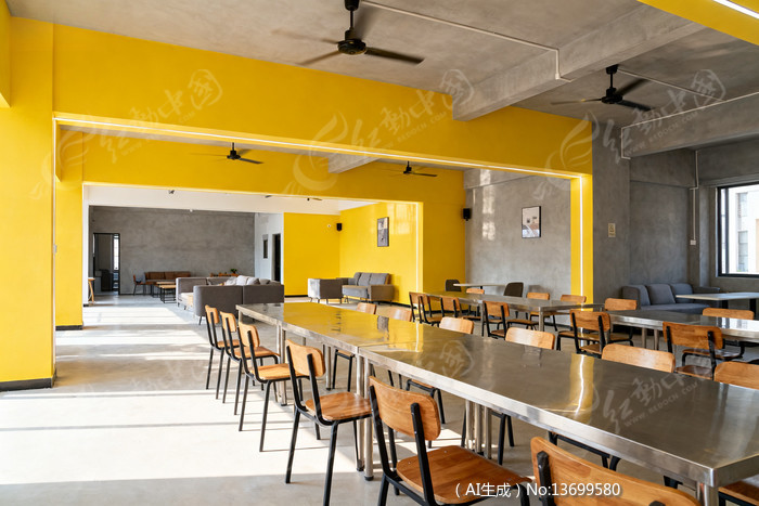 现代风格餐厅黄色墙面与灰色混凝土天花板
