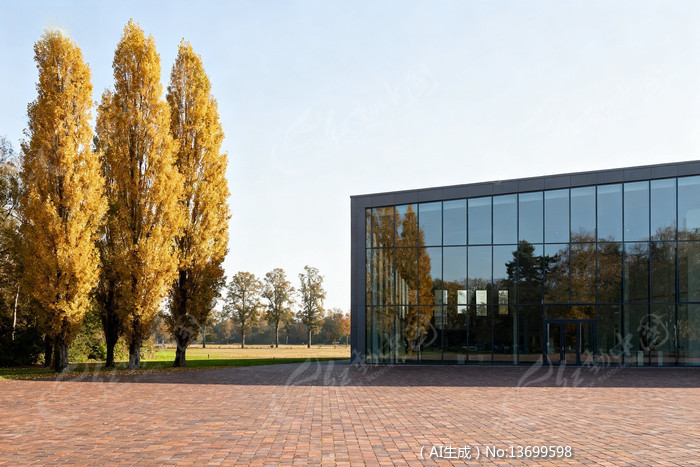 现代玻璃建筑旁的秋季金黄树木景观