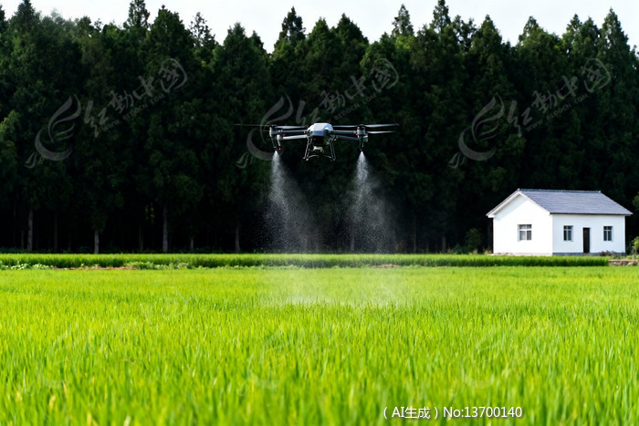 无人机在稻田上方喷洒农药