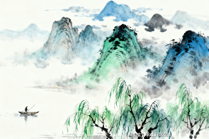 水墨山水画渔舟青山柳树云雾