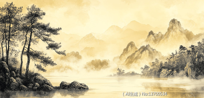 水墨山水画松林云雾远山