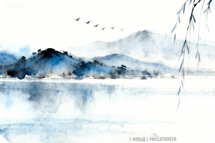 水墨风格山水画群鸟飞翔