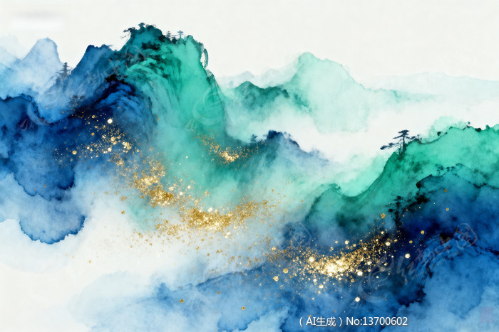 水彩风格金色点缀山水画