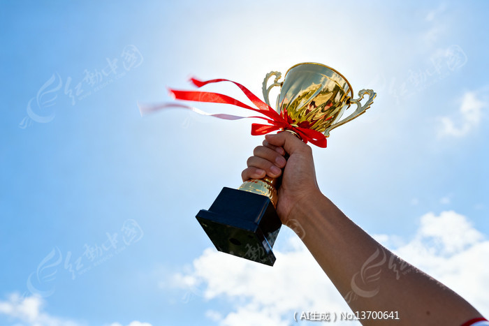 手举金色奖杯红丝带飘扬蓝天为背景