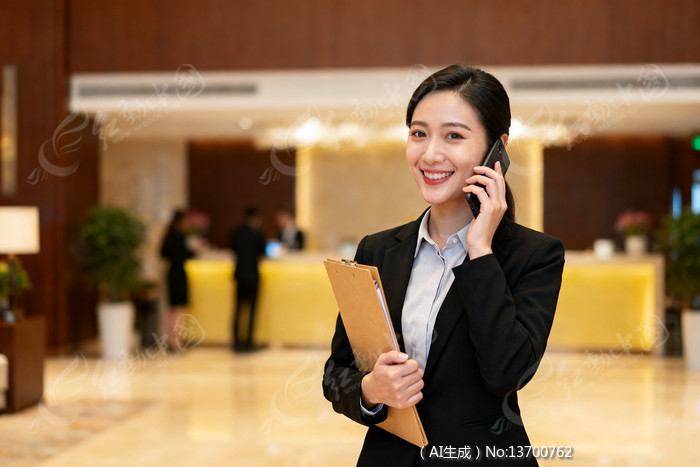 商务女性在大堂接电话并手持文件夹