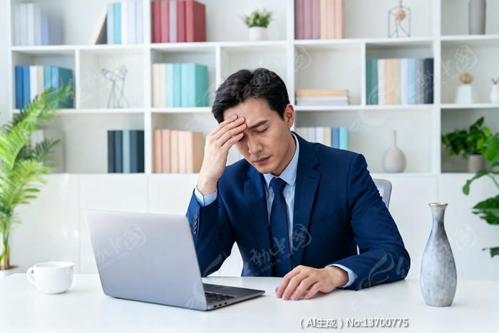 商务男士在办公室电脑前思考问题