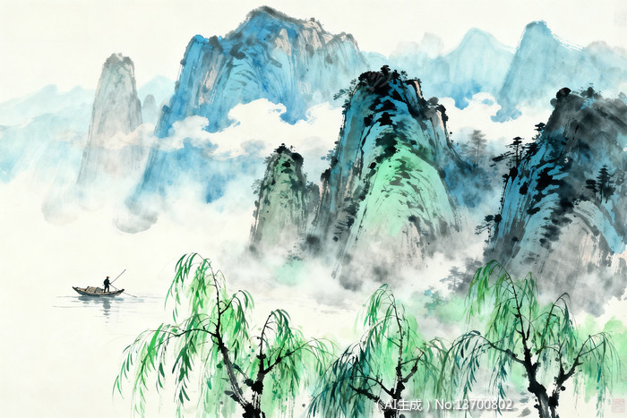 山水墨韵孤舟泛波