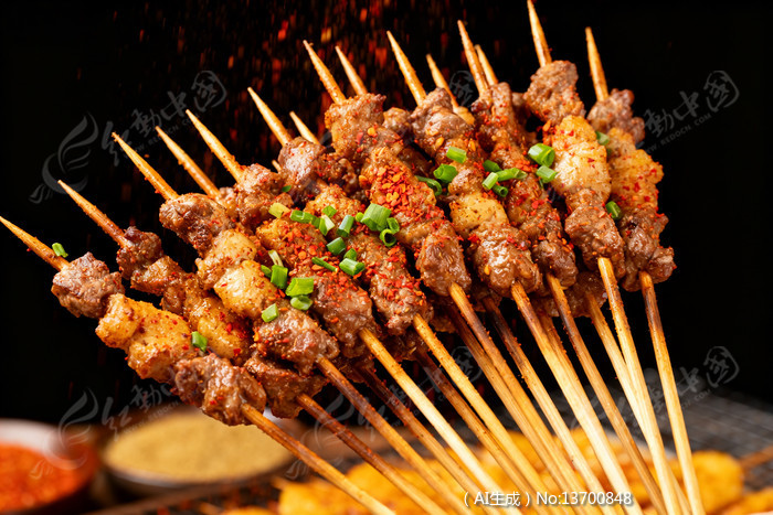 撒料中的烤串香辣牛肉与葱花点缀