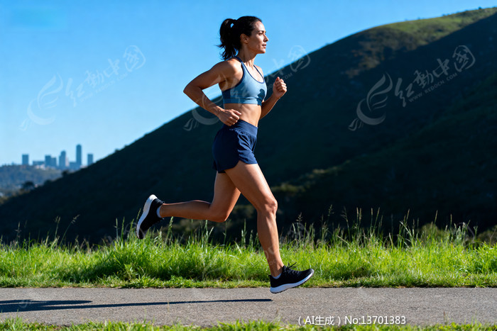 女子在户外跑步背景是城市天际线和山丘