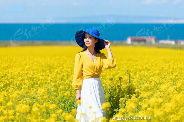 女子穿黄衣白裙戴蓝帽置身油菜花田