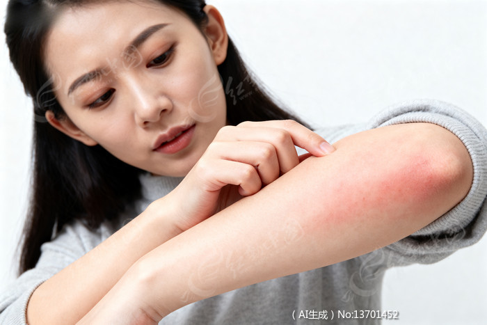 女性手臂皮肤发红疑似过敏或不适