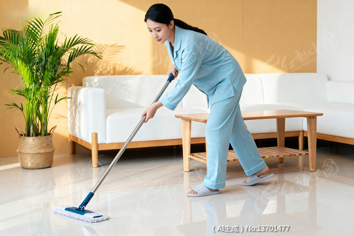 女性穿着浅蓝色家居服用平板拖把清洁地板