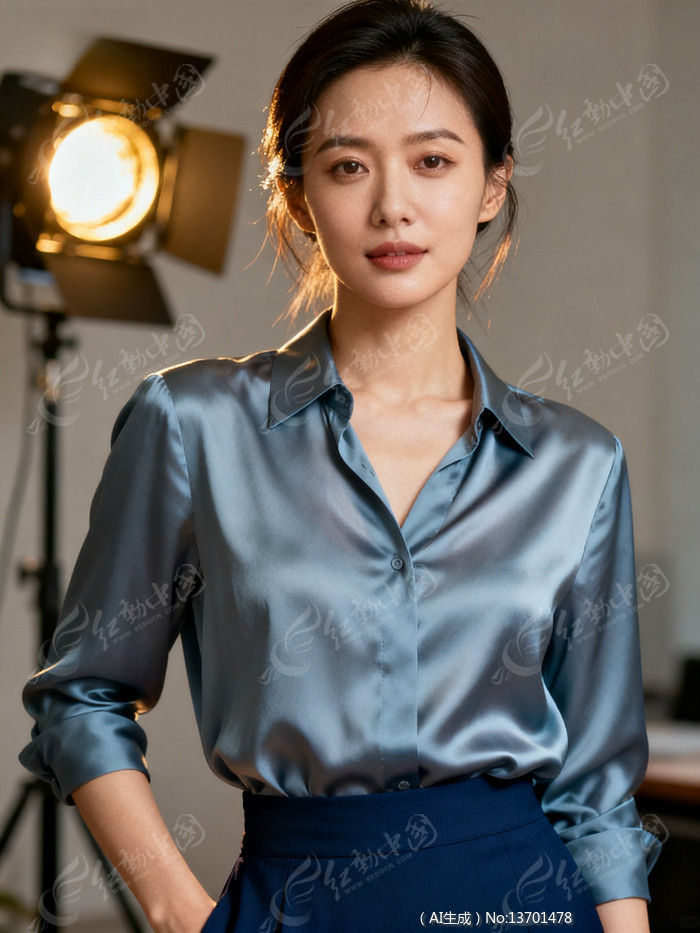 女性穿着蓝色丝质衬衫与深色裙子的半身照