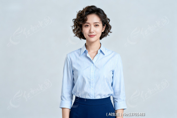 女性穿蓝白条纹衬衫搭配深蓝色裙子