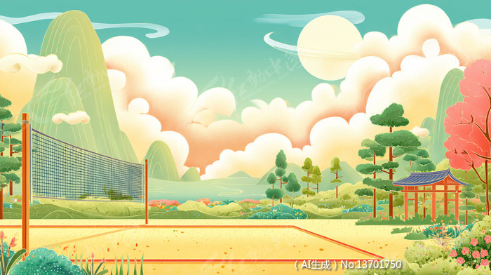 公园里户外网球场手绘扁平国风插画