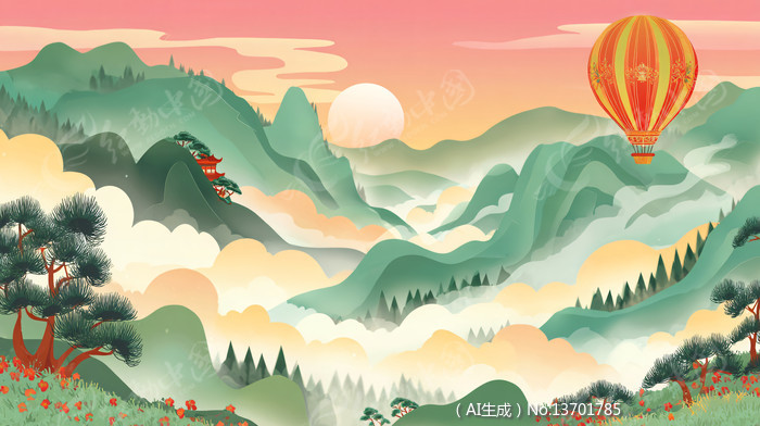 热气球在山脉中飞翔国风手绘扁平插画