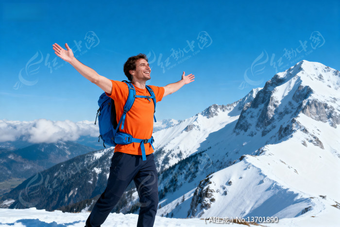 男子雪山徒步双臂张开迎蓝天