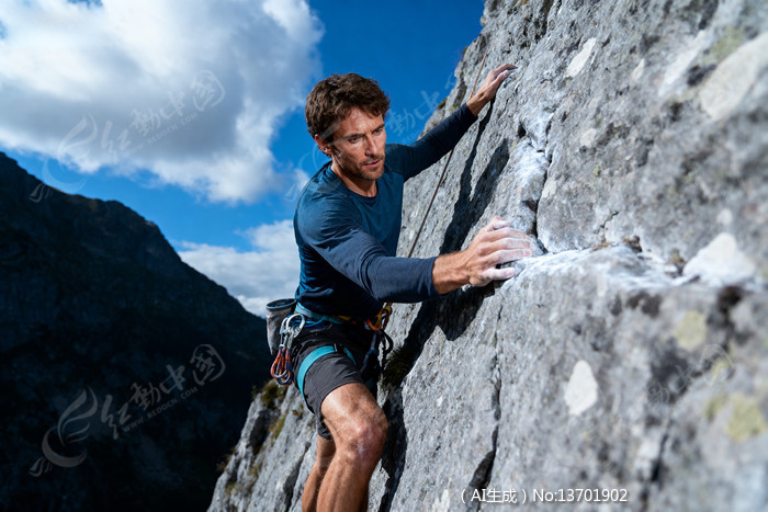 男子攀岩蓝天白云映衬下的专注姿态
