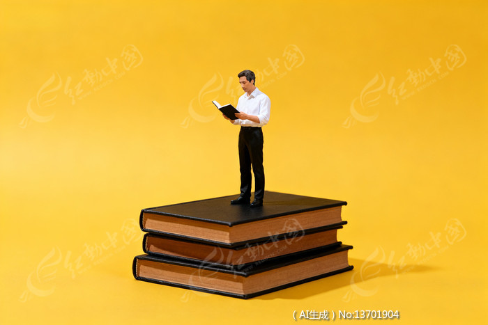 男子模型立于书堆上阅读背景为黄色