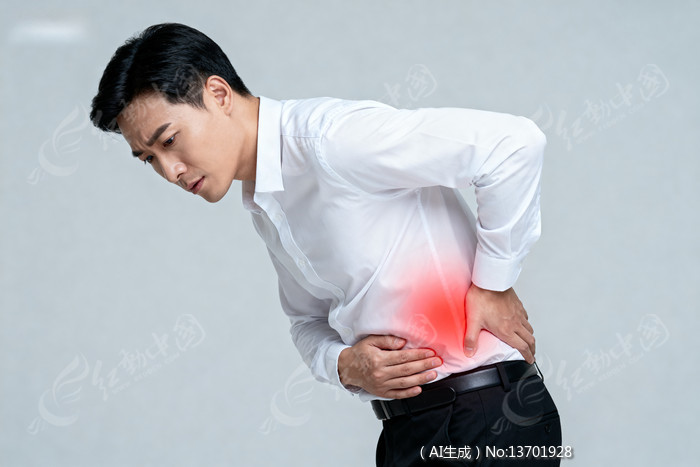 男性弯腰捂腰腰部红色疼痛标识