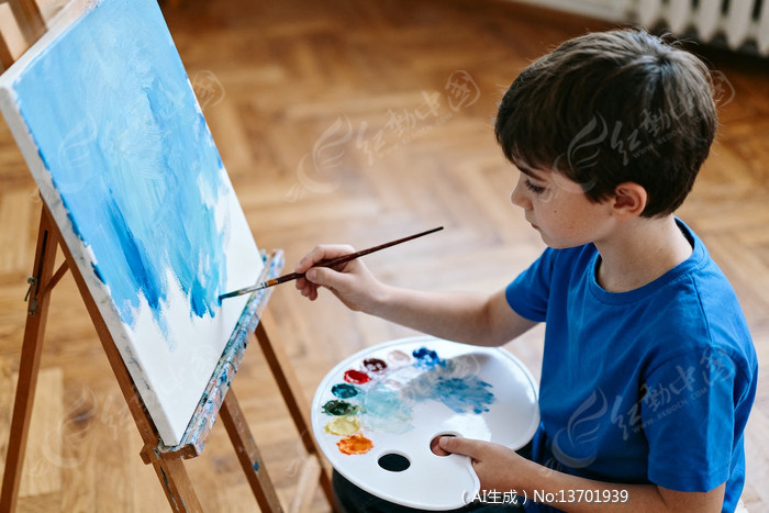 男孩专注绘画调色盘色彩丰富