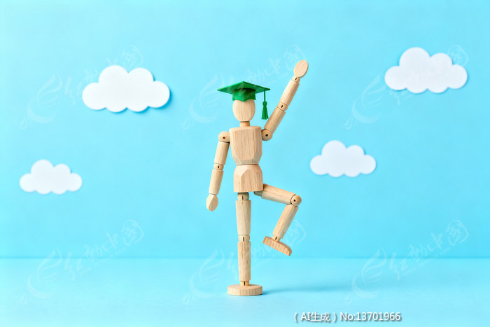 木制人偶戴绿帽单脚站立背景蓝天白云