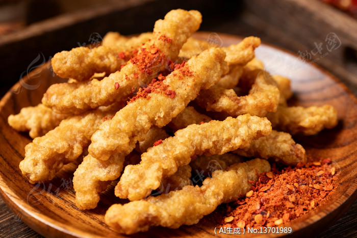 木盘上摆放的炸鸡柳撒有红色调料