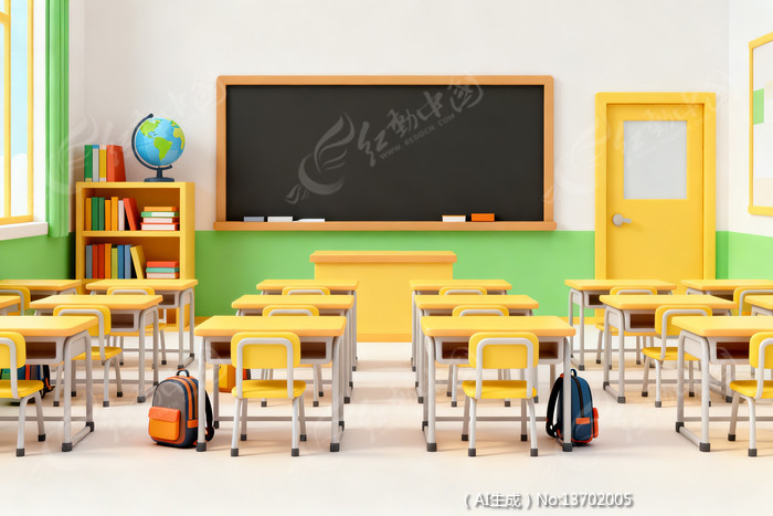 明亮教室黄色桌椅与黑板