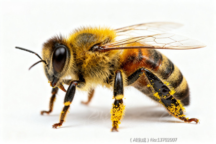 蜜蜂特写展现其黄黑相间身体及绒毛细节