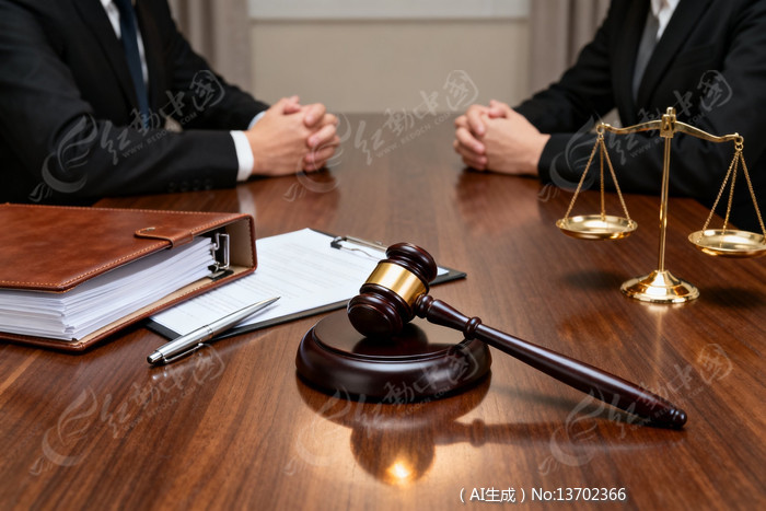律师桌前法槌与天平象征公正