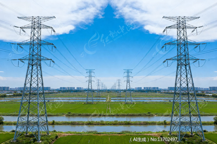 蓝天白云下的田野与输电塔