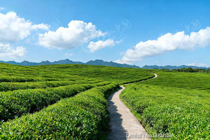 蓝天白云下的茶园小径