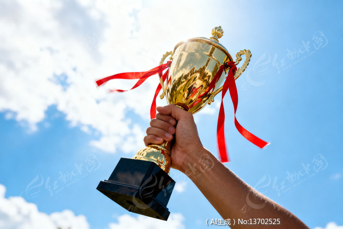 蓝天白云下金色奖杯与红丝带