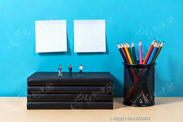 黑色书本上小人交谈旁边有彩色铅笔