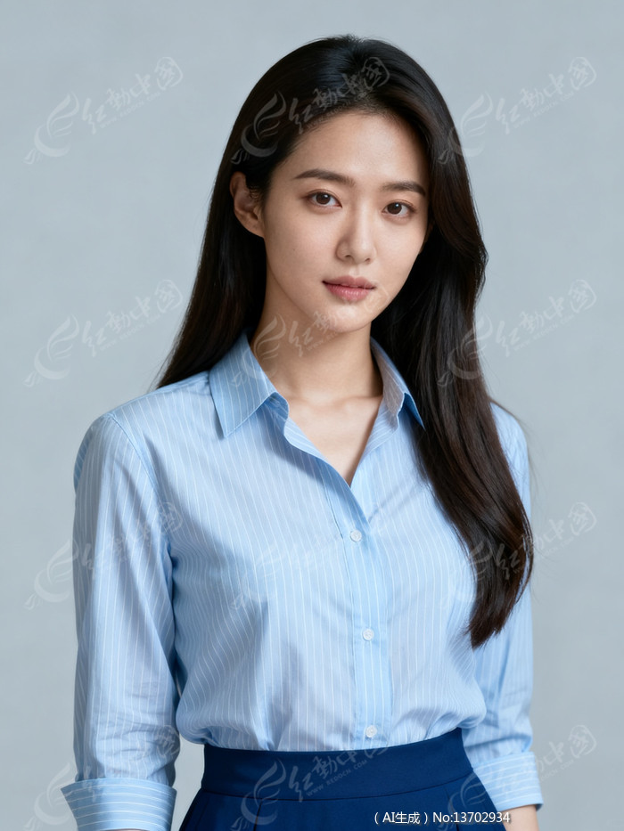 蓝衬衫与深蓝色裙装搭配的女性职业形象