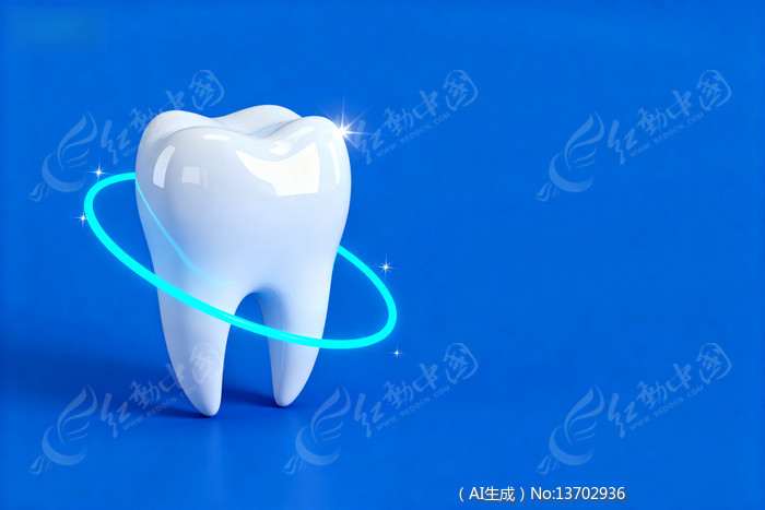 蓝背景中发光牙环环绕的洁白牙齿