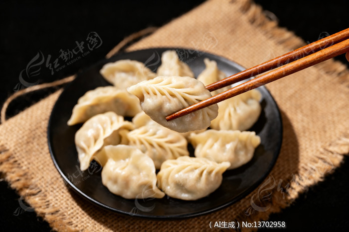 筷子夹着饺子黑色盘子里摆满饺子