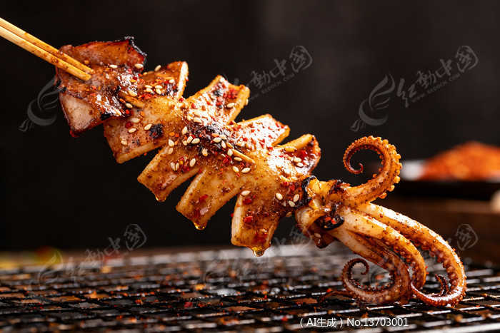 烤鱿鱼串撒满辣椒和芝麻